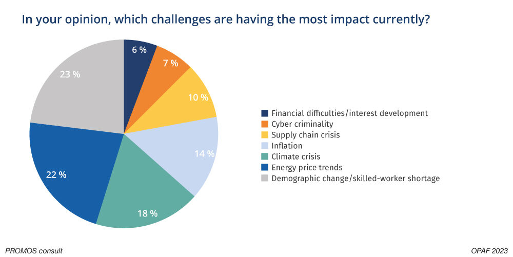![]() Figure 1: 23 percent of respondents view demographic change and/or the shortage of skilled workers as the greatest current challenge. (n=104) |