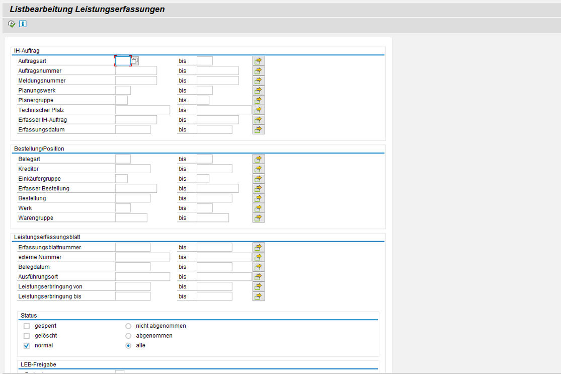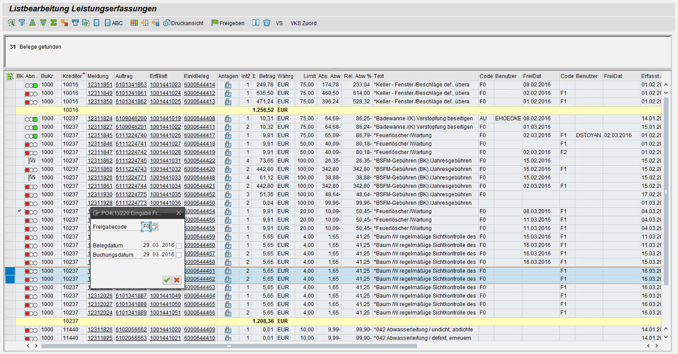 You can select service entries via the functional location, the report, the order, the order type or the order creator. Various displays are also available to you, such as the display of the above fields and other data from the PM order / the report, the display of the order value and the absolute / relative difference between the order value and the service entry sheet value, the display of the number of attachments, which enables you to call the attachment directly, and the display of which user released the service entry sheet at what time using which release code.