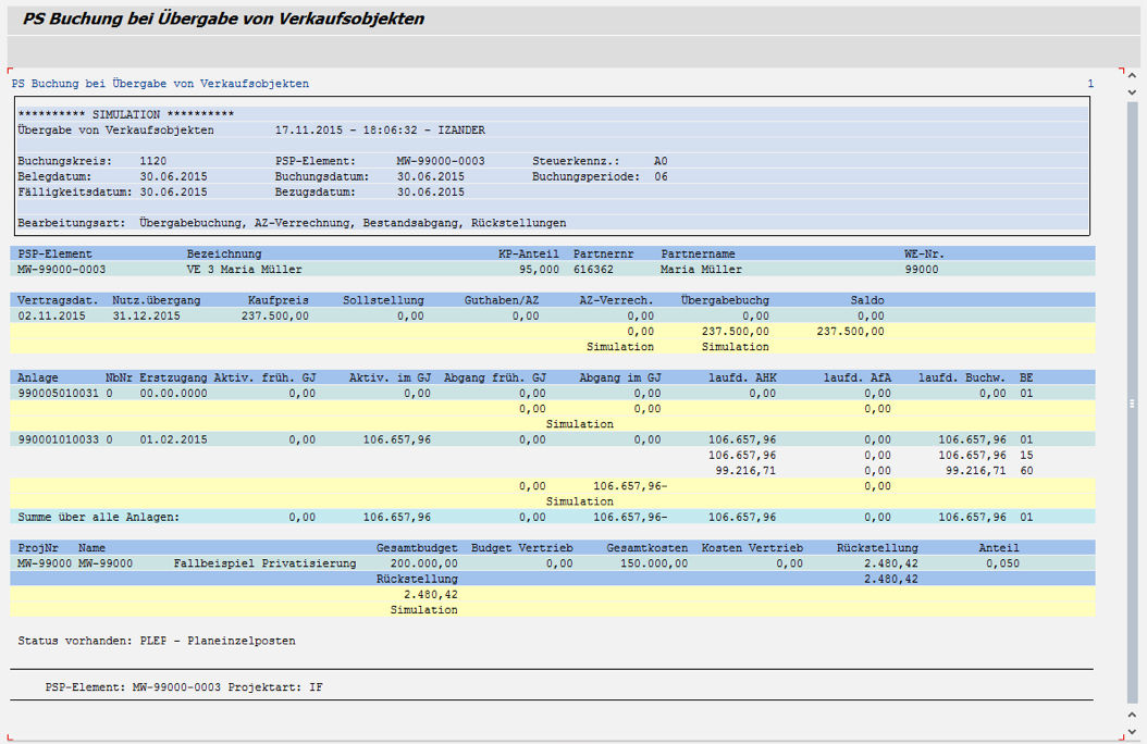 The construction projects are processed via the SAP® project system (PS) and purchase orders in a similar manner to construction processing. Planning in accordance with DIN 276 and budgeting is used for the WBS elements (cost groups). The budgeting is the basis for automatic determination and posting of allocations to provisions upon handover.