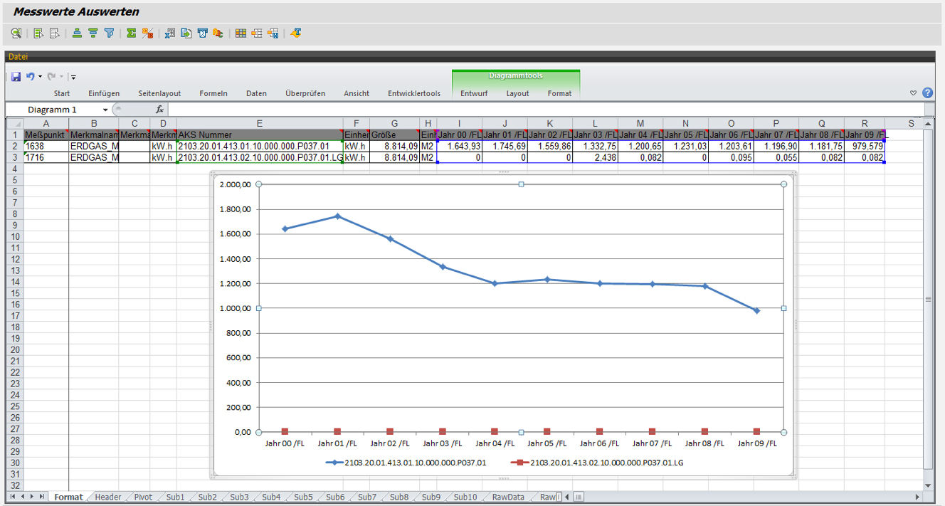 Meters as well as measuring points can be managed in the system. A configurable Excel upload is available for importing the measurement data. The units to be measures are set up in the system. Conversion into standard units is possible here (e.g. from litres of oil to kWh). External evaluation groups such as the DE numbers of the network operator, or internal evaluation groups such as asset IDs can also be used.