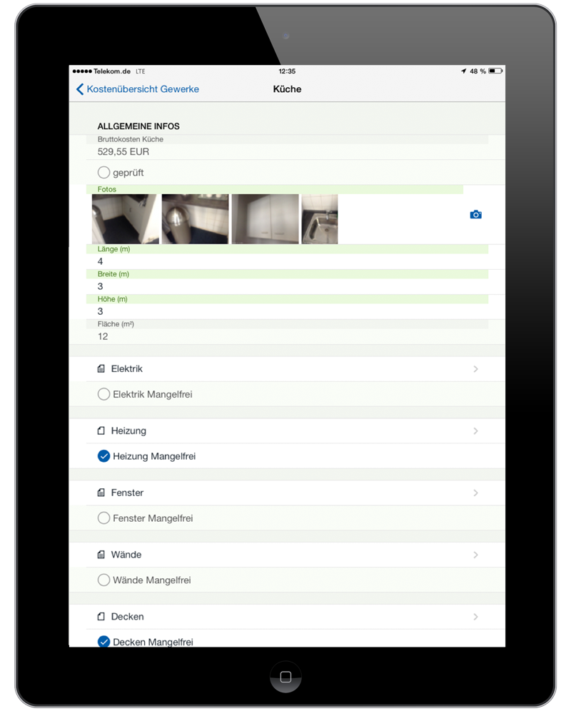 Easysquare vacant apartment refurbishment supports you in this regard. With the easysquare professional app, you can record any defects and refurbishment requirements easily and conveniently room for room. In addition, there is a clever calculation function directly in the app, which calculates the costs for the refurbishment using stored unit price catalogues.