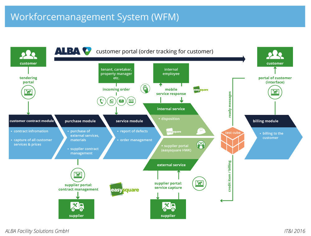 In the scope of defect recording, ALBA Facility Management Solutions GmbH’s workforce management system may specify an external provider to remedy the defect. In this case, just as for an internal service, an order is generated that is then transmitted directly to the service provider in question via the easysquare supplier portal. The supplier can accept the order, perform the service in accordance with the stored supplier contracts and then report back that he has done so. Once the ALBA Facility Solutions GmbH employee releases the service, billing can then be performed via the portal. This allows the best possible integration of external service providers.