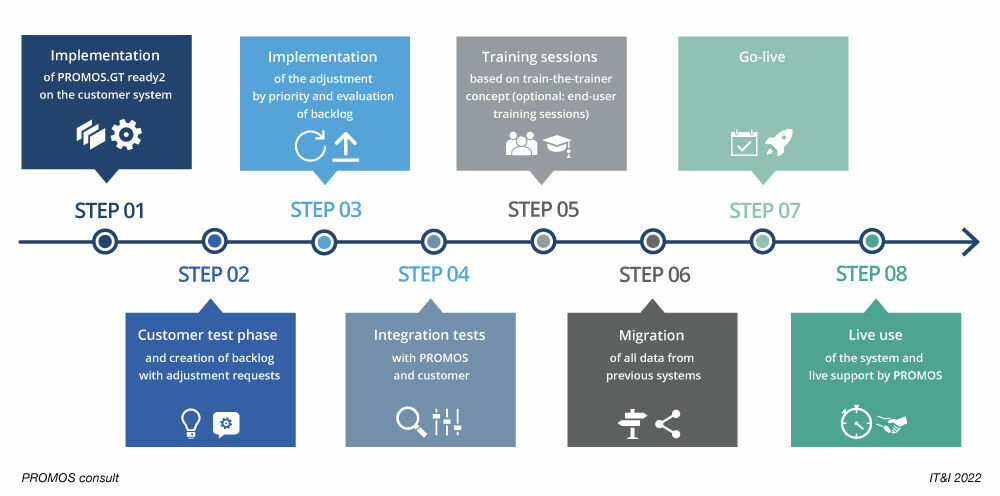 ![]() Figure 1: The extended project approach for PROMOS.GT ready2 includes delivering the complete system within a few weeks in order to provide a basis for defining customised adjustments. Steps 2 and 3 are omitted in the standard approach. |
