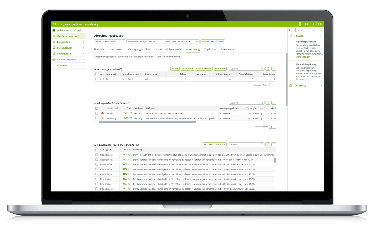 To ensure that everything is working correctly, you can check master and transaction data for errors and inconsistencies. Modular analysis methods are available for each process step. In addition, the error check also lists plausibility problems, for example indicating a major deviation in consumption compared to the previous year. Transaction data such as meter reading values, consumption and costs can be compared. The results can thus be prepared to meet your individual needs.