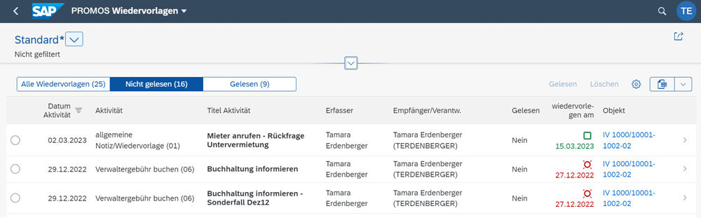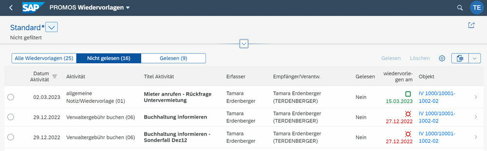 With PROMOS resubmissions for SAP Fiori®, Fiori users can easily create resubmissions for various master data objects in the Real Estate environment, assign them to themselves or others as a one-off or regular task and also manage them clearly in a shared app across all master data. The small tile in the launchpad acts as a personal work basket that you can use alone or in a team.