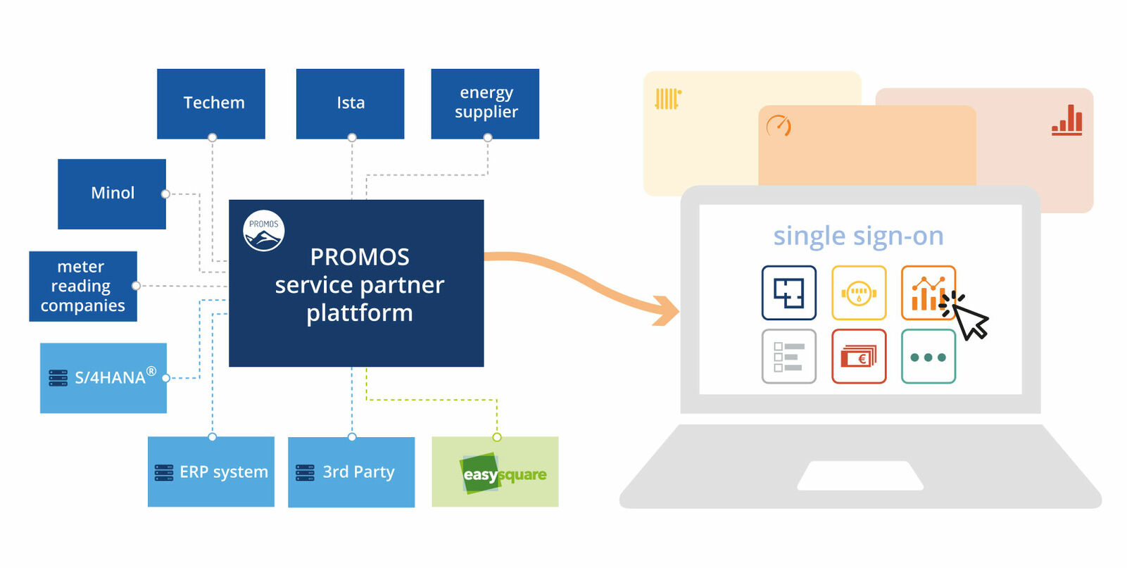 For this reason, PROMOS has developed an open and scalable service partner platform that offers you a centralised access point (Single Sign-on) to your digital utility cost management – regardless of how many services and service partners you have connected. It forms a bracket around a wide range of solutions, for example standard applications from SAP®, PROMOS tools, external services or the connection of external partners, such as service providers, local authorities, supply and waste disposal companies, heating meter reading companies, etc.
