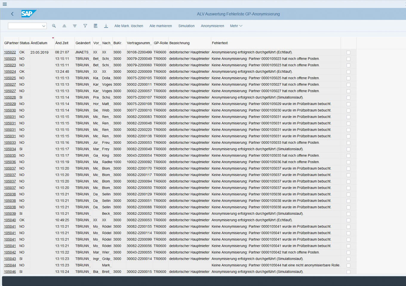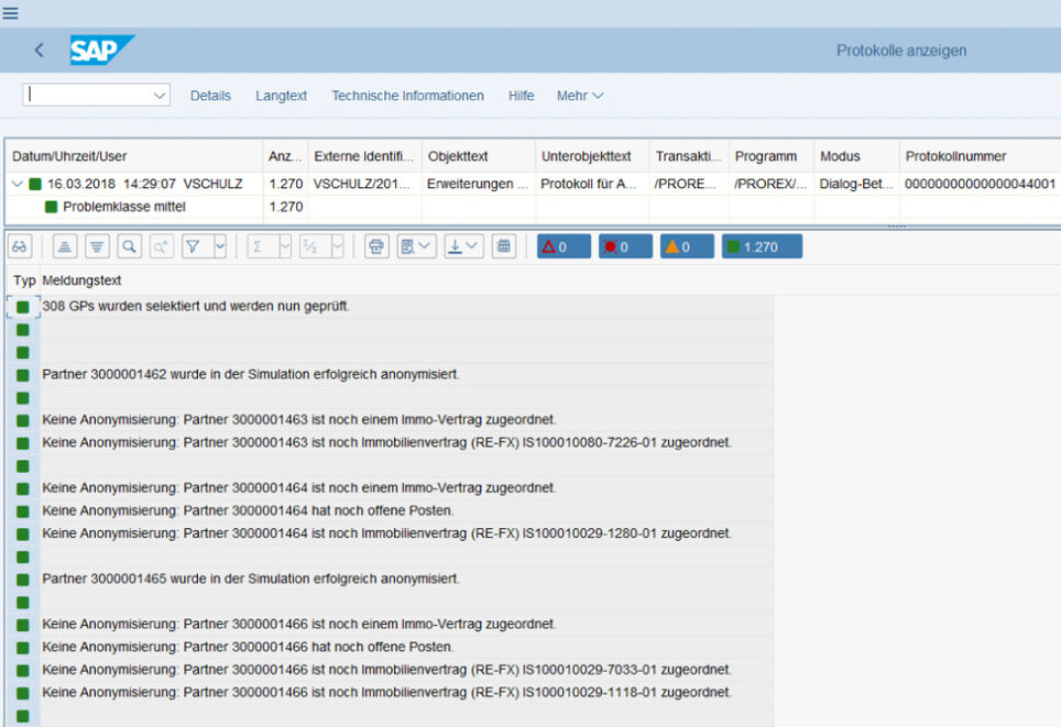The solution also includes the option of generating a list containing an overview of all completed simulations, anonymisations and errors as well as anonymisations prevented due to technical checks. Due to its completeness, this evaluation list can be used as proof for auditors or data protection officers, for example. After a successful simulation run and approval, business partners can also be anonymised directly from the list.