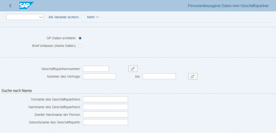Existing contracts and/or business partners can be searched for according to various criteria using the “Personal data of business partner” tile.