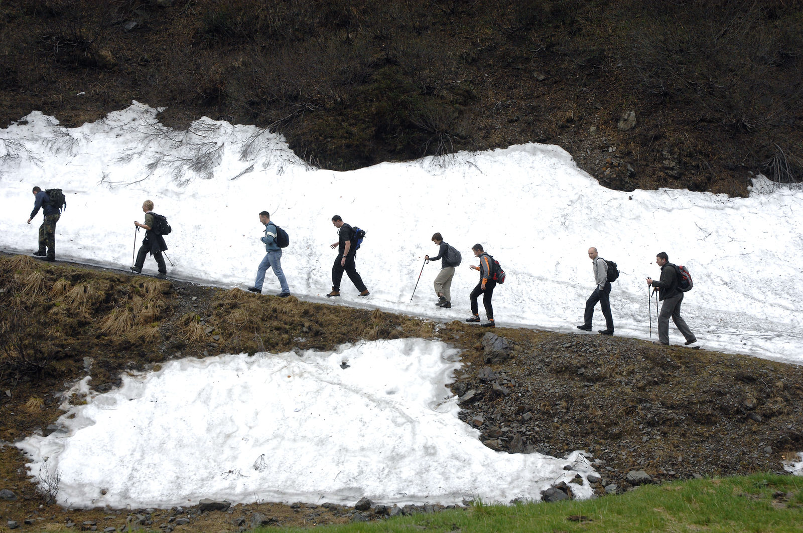 ![]() Wer raufkommt, muss auch runterkommen. Auf krummen Pfaden bahnen sich die PROMOS Bergsteiger ihren Weg ins Tal.  |