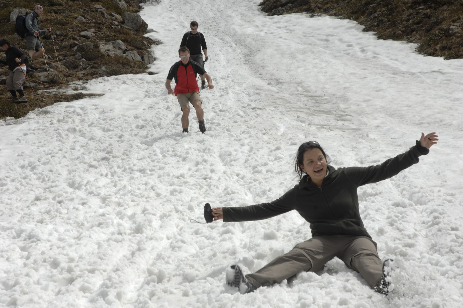 ![]() Höher, schneller, weiter? Höher als bis zum Gipfel konnte das Team nicht aufsteigen. Weiter blicken als bis zum Horizont war unmöglich. Blieb nur noch ein schneller Abstieg: Wie hätte das besser gelingen können, als mit einer Rutschpartie im Schnee?  |