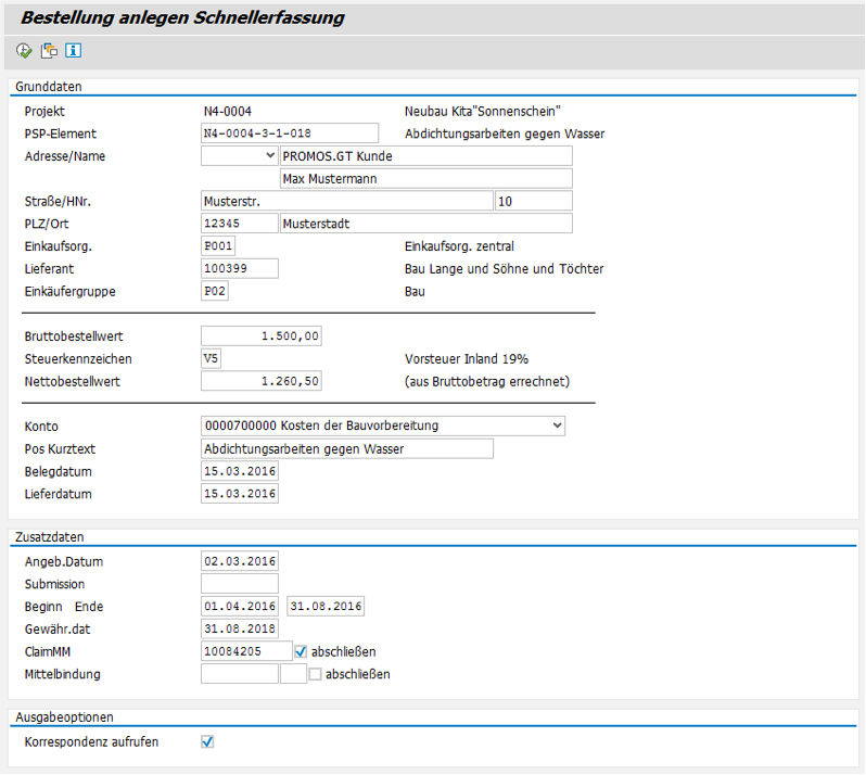 The PROMOS solution enhances the standard SAP® system with additional functions. Here, a single screen without different tabs is used to record construction orders. The key data can be entered in a fast and straightforward manner, and the system then applies this data to standard SAP® order creation. This allows even inexperienced users without extensive knowledge of SAP® MM, such as architects or engineers, to record orders.