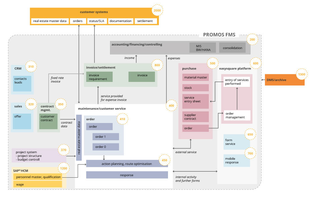 To keep track of things at all times, PROMOS has developed an SAP®-based workforce management system as a platform on which users can execute the workflows smoothly. Here, functions from the SAP® modules PM, CS, MM, FI, CO, PS, SD, MRS and RE-FX are available to the customer. The functional scope allows planned / unplanned orders to be carried out and managed in the service module, material and external services to be procured in the purchasing module, contracts to be awarded to suppliers and external service providers via the easysquare supplier portal, fully automated MRP and connection of mobile work steps with easysquare mobile, and invoicing to the customer.