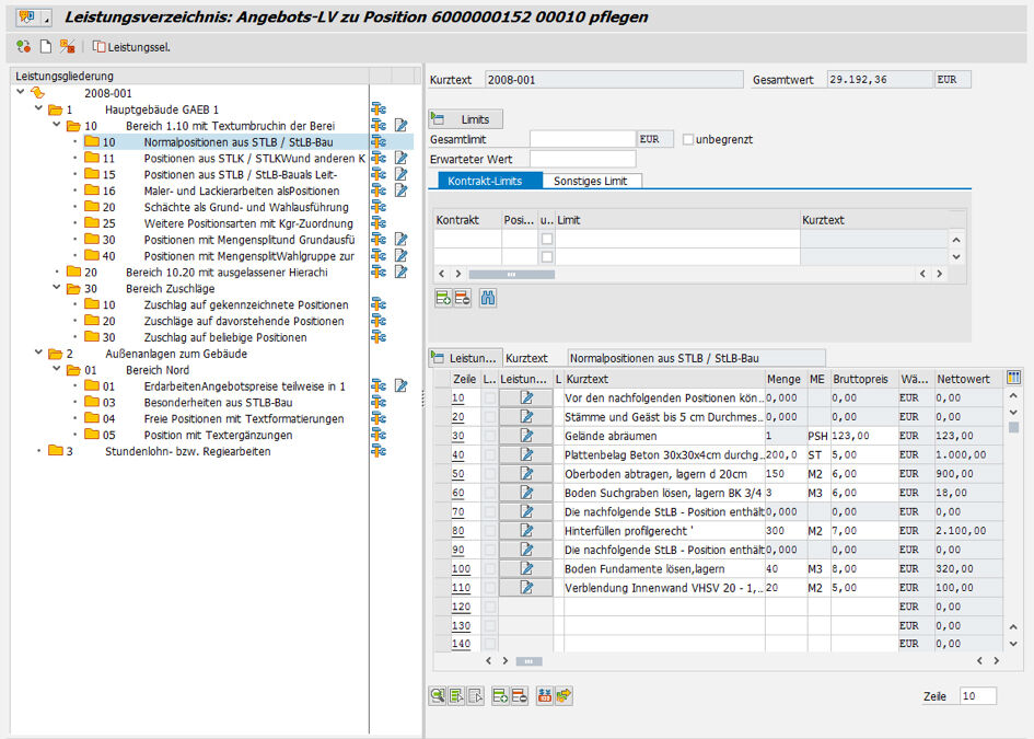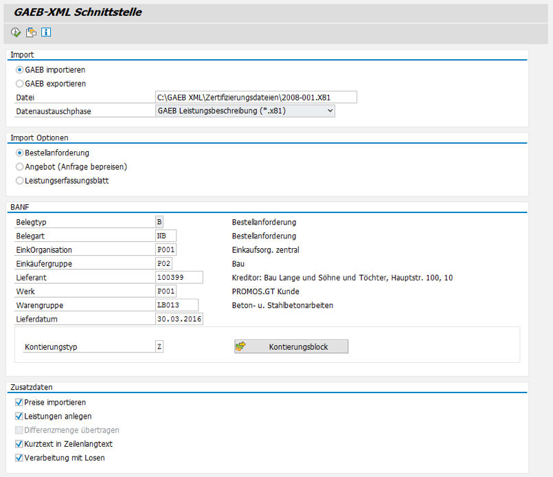 GAEB maps the tender process between the ordering party (be it a public entity or a planning company) and the contractor electronically and without paper. PROMOS provides a GAEB interface in SAP® that can be used to import and export GAEB files for exchanging service descriptions with quantities and prices between those involved in the construction and to read in the GAEB service specification as a new SAP® service specification. This allows you to process documents with structured service specifications. In SAP®, service specifications with a specific structure are crucial and these are processed in connection with documents from logistics PM/CS or MM modules), orders, purchase requisitions, purchase orders, sample service specifications, enquiries / offers and contracts in vendor business transactions.