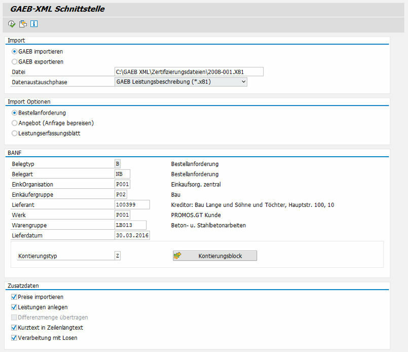 - GAEB DA XML: GAEB DA XML V3.1 is assumed to be the version that is commonplace on the market. This is currently the preferred GAEB version for importing GAEB service specifications into SAP®. The long-awaited GAEB DA XML V3.2 still needs to prove itself on the market and will be supported in future versions.