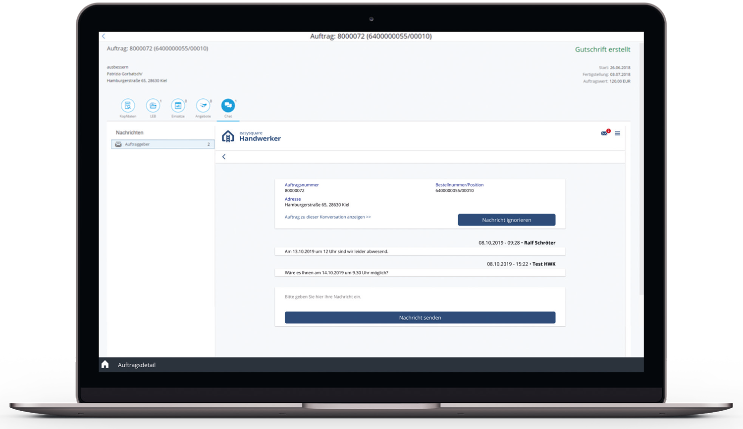 Appointments with tenants can be coordinated easily and directly using a chat function. Questions about an order can also be transparently tracked in the course of communication.
