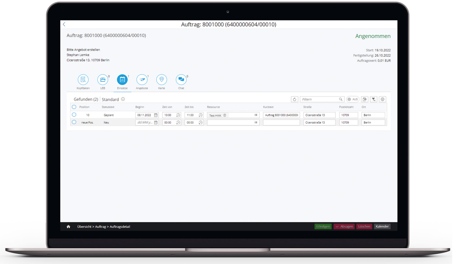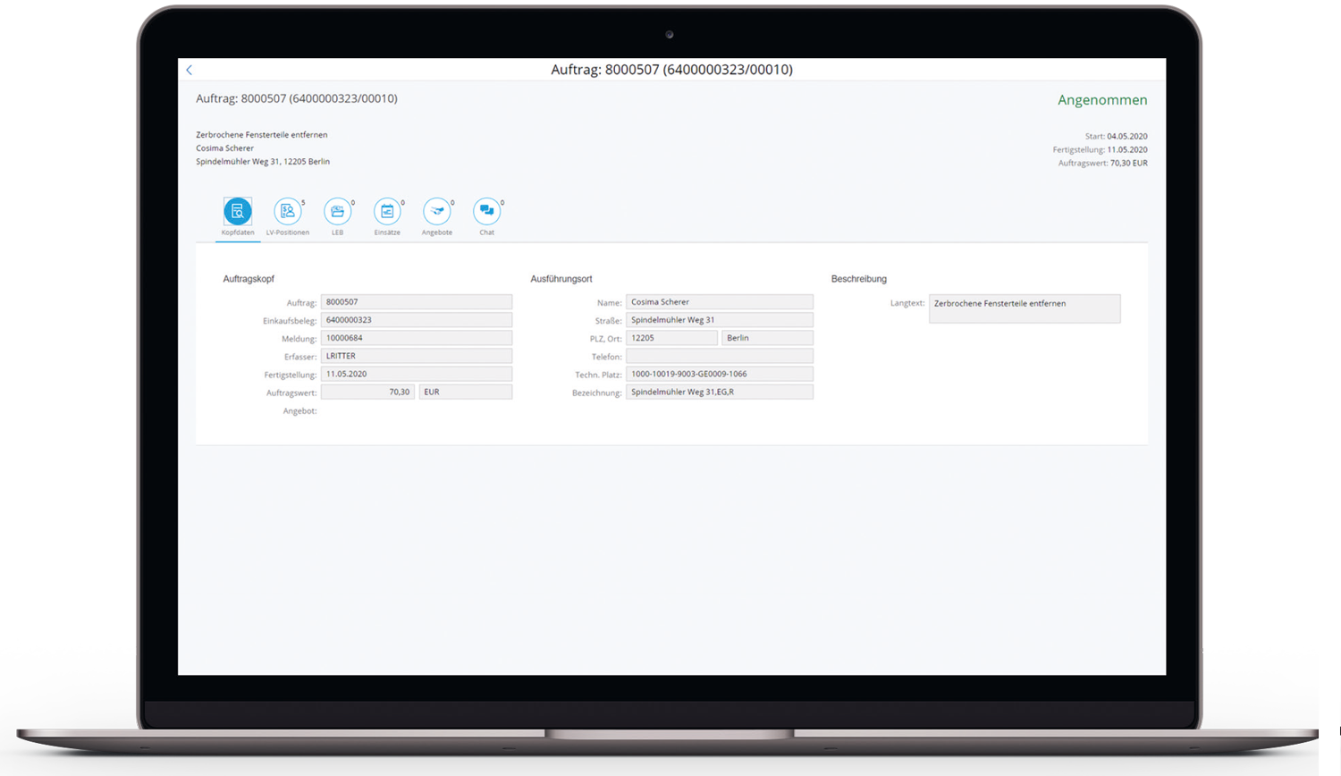 When a service needs to be performed, the real estate company sends the order to be awarded to the trade company from their SAP® system. The external service provider can log in to the craftsmen portal conveniently on a PC or on a mobile device using the app and decide whether to accept or decline the order. The order contains all the key information and can be printed out as a data sheet if required.