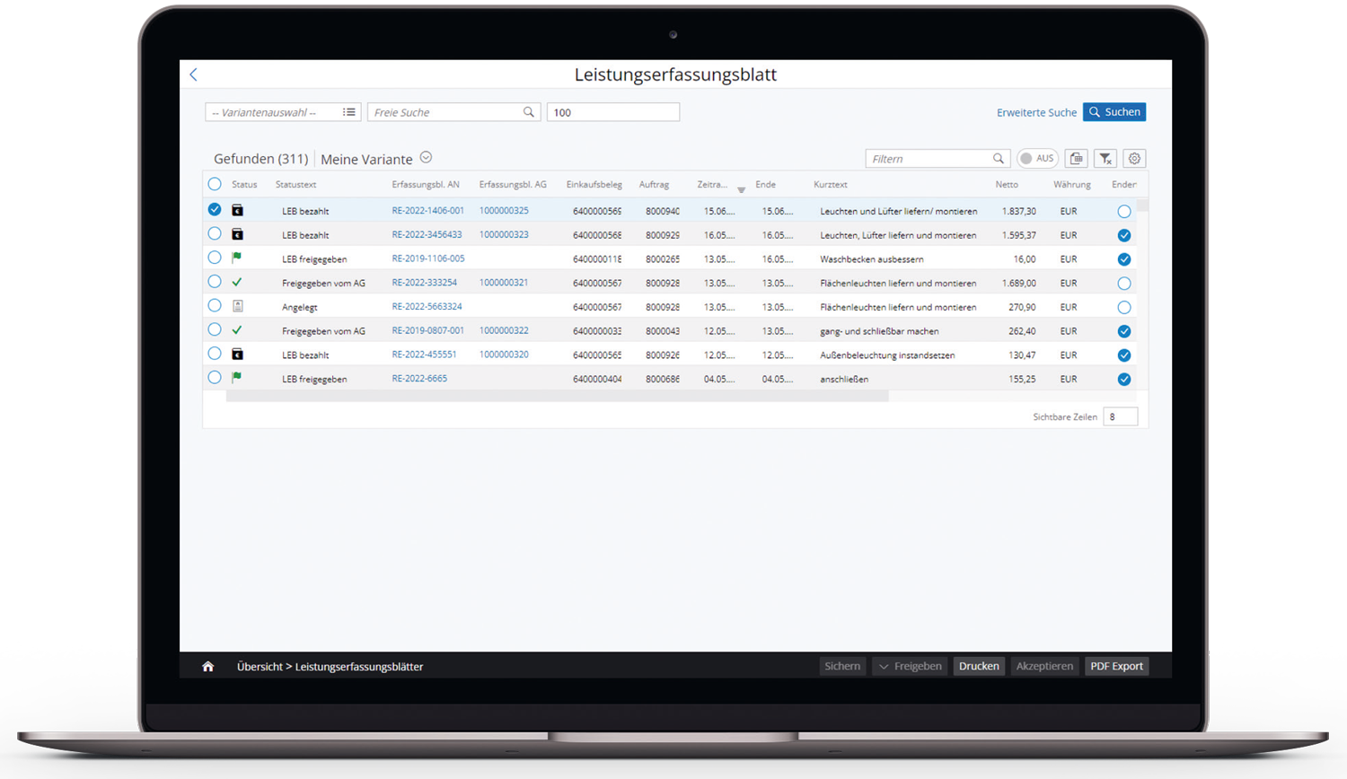 ![]() All services provided are registered in the easysquare craftsmen portal and summarised at a glance in an overview of all service entry sheets created with the most important information on the order status, the level of service or the service period. |