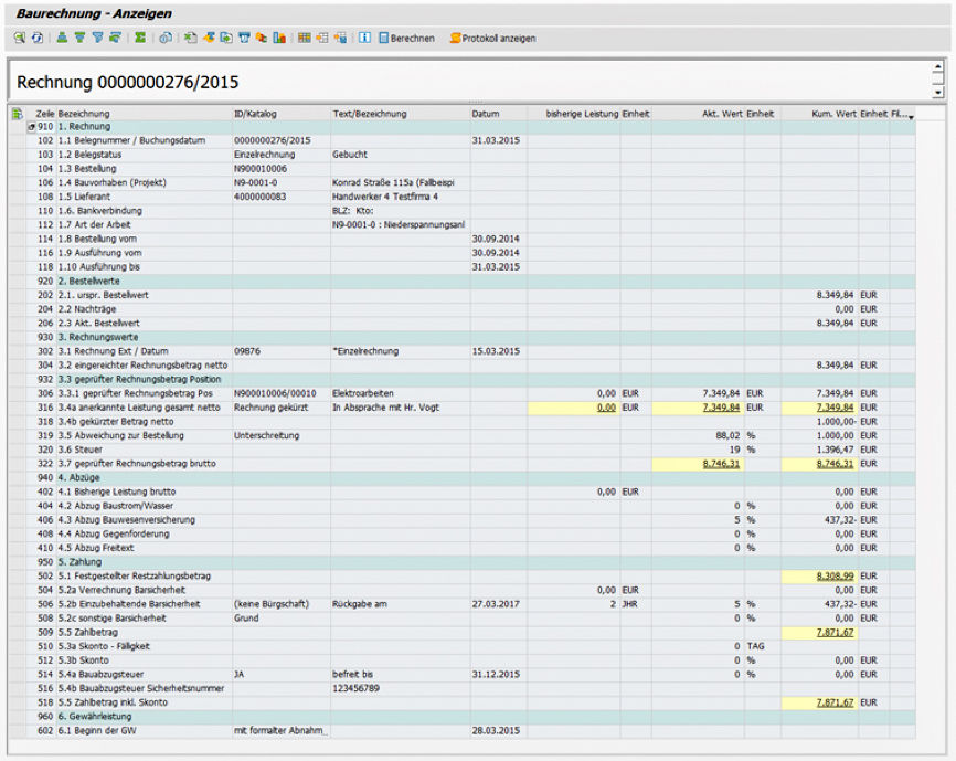Transparency: The PROMOS verification of construction invoices presents important invoice details in a clear manner in a chronologically organised SAP® calculation and check sheet.