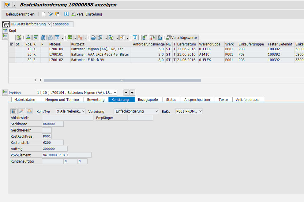 Master data: For recurring orders, there is a useful function for maintaining materials or services with prices, which makes such orders faster to process. Automatic account determination can also be defined via materials. Recurring payments are mapped with framework orders using invoicing plans.