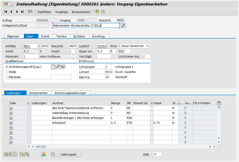 Various different operational services need to be carried out as part of real estate management, such as lawn maintenance, a large amount of minor maintenance work and regular cleaning of stairwells. In-house service employees are often available to carry out this work. Provision of these services must be mapped in the SAP® system just like an external order and taken into account in accounting.