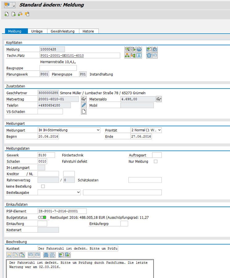 - Ad hoc entry of the tenant’s communication data: The defect recording form can be extended so that the tenant’s communication data for the relevant rental objects is not only displayed, but can also be recorded or updated directly on site. This process results in a direct adjustment of the tenant data in SAP®.