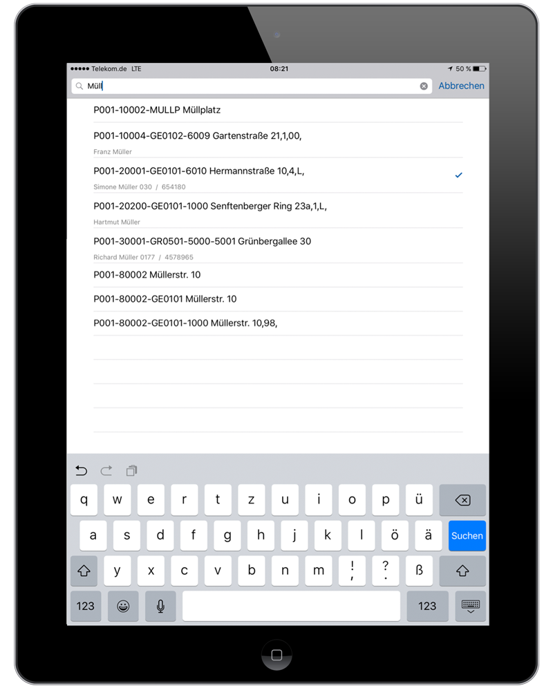 - Ad hoc entry of the tenant’s communication data: The defect recording form can be extended so that the tenant’s communication data for the relevant rental objects is not only displayed, but can also be recorded or updated directly on site. This process results in a direct adjustment of the tenant data in SAP®.