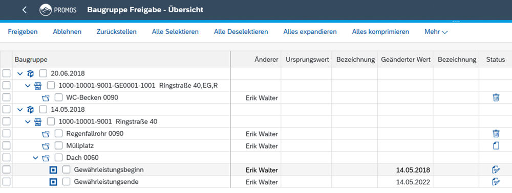 After saving the amended inventory data, the data is transferred to the SAP® system asynchronously. The mobile changes are then made available on request in SAP® in a release dialogue according to the principle of dual control. The dialog prepares the mobile data in a tree structure with the following hierarchy: date > functional location (ID + description) > assemblies with status (deleted / added). The users can use the structure to identify at a glance which changes have been made at what time and at which location.