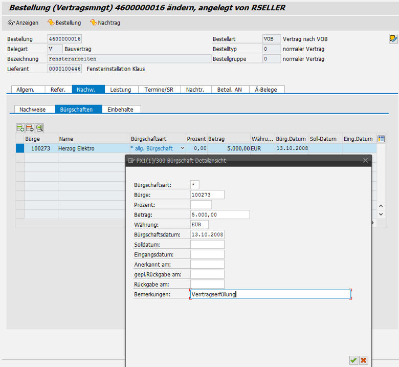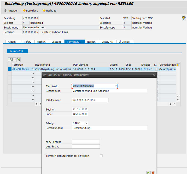 Construction order management is integrated into the SAP® order processing functions, which means that you can call the additional tab / functions from the purchase order and switch to the purchase order from the order screens. It is also possible to generate correspondence.