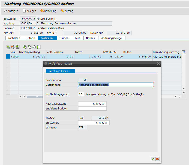 Changes to the construction account are mapped in SAP® via supplements. The supplements are created with reference to the order and can contain a reason for the supplement (e.g. additional work VOB/B § 2 No. 6) or a short text or note.