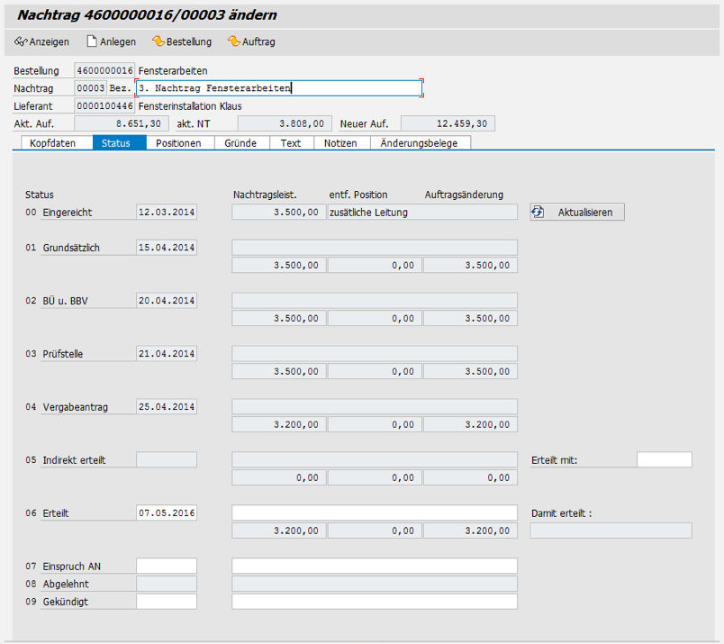 In the event that work increases or decreases, the supplement value is adjusted, which automatically updates the order values. The total of the supplements is presented in the order via a separate condition, which means that the original order, supplement totals and current order value also remain visible in the order. For the purpose of checking and taking into account the budget, it is possible to generate a resource commitment when recording the supplement, so that supplements can only be created or changed within the scope of the budget.