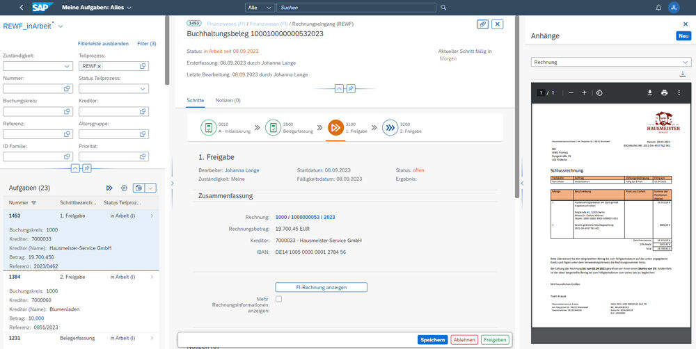![]() Figure 4: Thanks to the split-screen display of documents in the release process, users can quickly and easily get an overview of all necessary information and check and release invoices. |