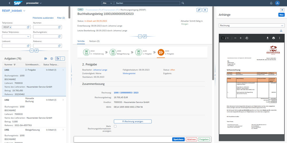 ![]() Figure 4: Thanks to the split-screen display of documents in the release process, users can quickly and easily get an overview of all necessary information and check and release invoices. |