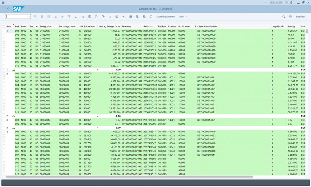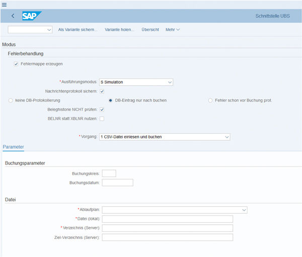 The data to be transferred is initially maintained based on an individually definable logic in a structured data format (XLS, CSV, etc.). This preparation of the data helps prevent potential errors when transmitting the data. The universal posting interface can also be used to check the input file for any errors. This simulation checks whether all mandatory fields in the file have been completed and correctly mapped, for example the transition of an external account number to the SAP account number. In the result of the simulation, a list provides information on any errors that were detected.