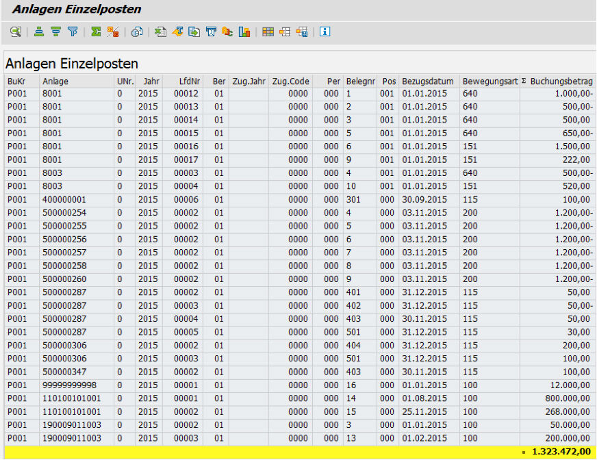 After defining criteria in the selection screen, an overview of the account line items for selected assets is created. This function allows the user to compile a posting overview with subtotals, as required. The list can be used for checking postings as part of year-end closing, for example.