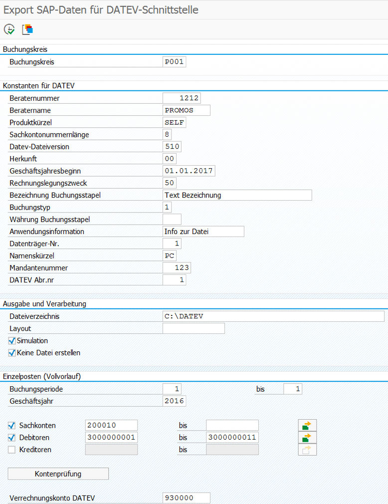![]() Selection screen for specifying the postings in the PROMOS DATEV interface  |