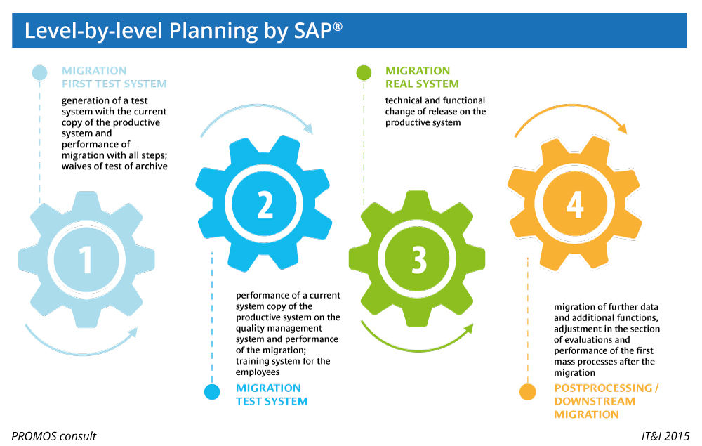 When it comes to the procedure in the migration process, PROMOS works in line with the level-by-level planning recommended by SAP®, which is generally valid for all migration projects. There are four stages to this procedural plan (figure 1).