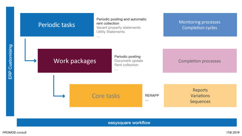 This constantly recurring manual effort was a thorn in the side for PROMOS. In the age of digitisation, it simply had to be possible to develop an automated method to handle core business processes. This was the impetus for the project team’s vision to centralise all work steps involved in periodic tasks and provide an administrative overview to a set group of participants. For this purpose, they created a control dialogue which bundles all of the complexities entailed by periodic work and navigates them using easysquare workflow processes. The solution was implemented based on the example of the periodic rental debit position and the accompanying rent collection.