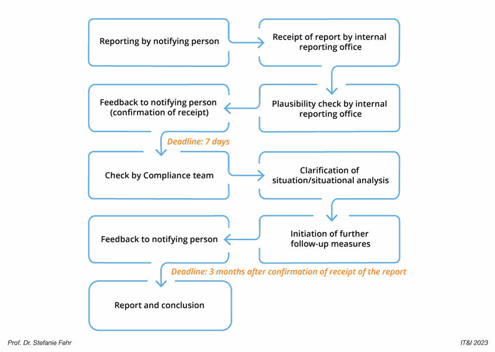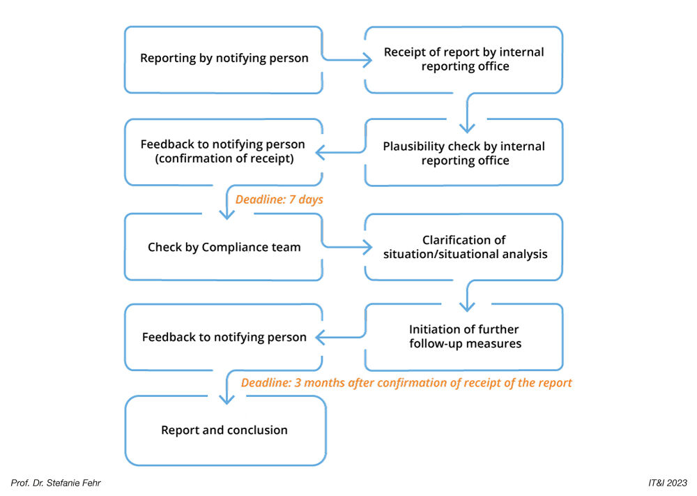 Pursuant to Section 17 HinSchG-E, the internal reporting office confirms receipt of the report to the whistleblower after seven days at the latest, checks whether the reported violation falls within the material scope of application, maintains contact with the whistleblower, checks the validity of the submitted report, asks the whistleblower for further information if necessary and takes appropriate follow-up measures. Thereafter, the internal reporting office provides feedback to the whistleblower within three months of confirming receipt of the report. In doing so, the company must ensure that any feedback to the whistleblower does not affect the internal investigation or enquiry and does not prejudice the rights of the persons who are the subject of the report.
