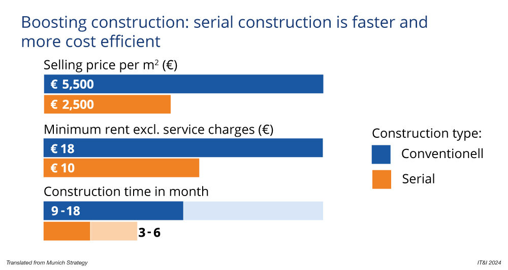 Figure 2: According to an analysis by Munich Strategy, serial construction is significantly faster and cheaper.
