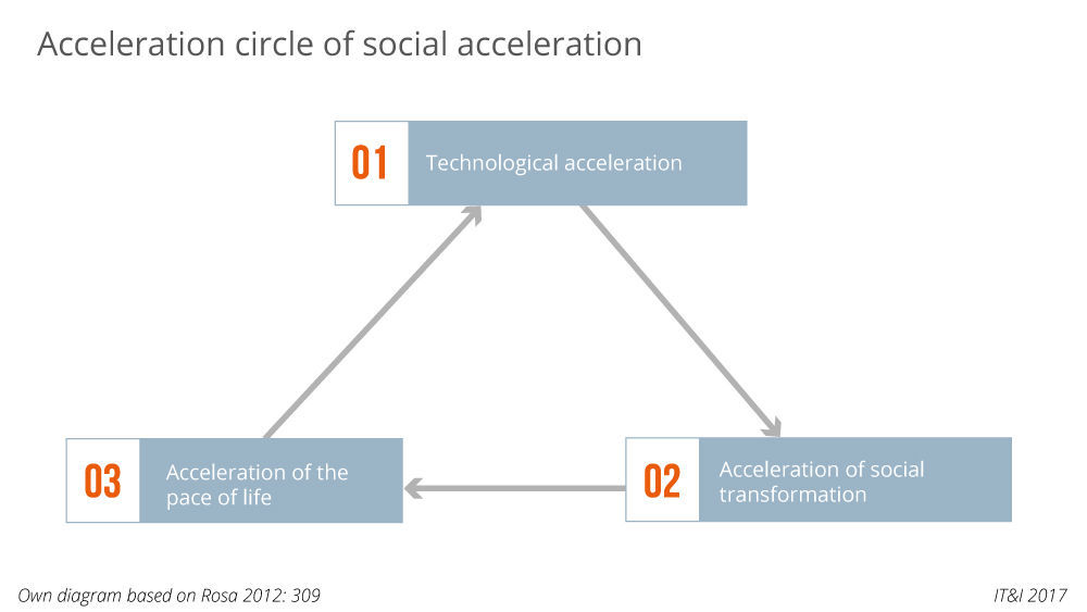 To sum up, we can see that the three dimensions of social acceleration discussed above form a closed, self-driving and ever faster “circle of acceleration” [Rosa 2012: 251]. Technological acceleration results in an acceleration of social change, leading to an increase in the pace of life, which can only be realised through technological acceleration (figure 1).
