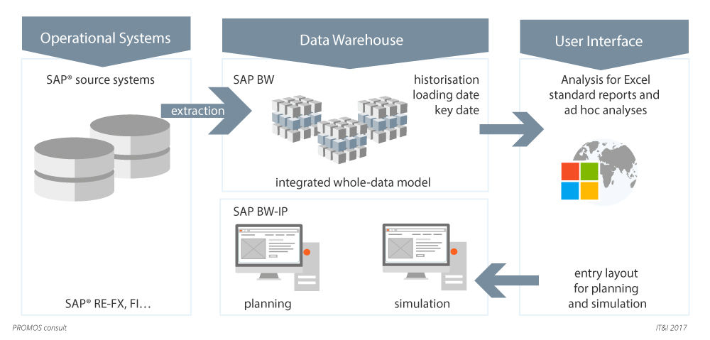 Figure 2: Architecture of the “Plato” solution: realisation on the basis of SAP BW and its integrated planning (SAP® BW-IP) as well as the Excel-based frontend tool SAP (Analysis for Excel).