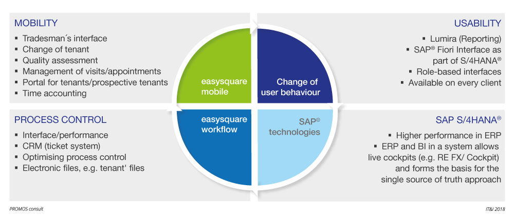 Capability for the future: The open system structure of SAP® ERP allows the scope of functions to be individually adapted and extended. This made ERP a very successful IT platform for many years. However, technology has its limits with regard to the digital transformation and the associated change in our work processes. S/4HANA offers the necessary foundations and agility for taking advantage of big data, machine learning, artificial intelligence and the Internet of things. The Single Point of Truth, valuable predictions based on live data (e.g. on use of floor space, building costs or financial flows) and the direct analysis of results without limits to their usability in respect of time, place or specific devices will turn vision into normality in the near future.