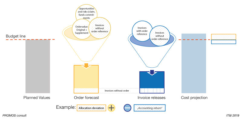 During calculation of the cost projection, all of a construction project’s determining financial factors are taken into account. It is calculated from the planning values along with the allocation and accounting deviations (Figure 1). The values are comprised in detail as follows: The order forecast is used as the basis for calculating the two deviation values. The order forecast represents the sum of all order values as well as claims and committed funds, and therefore contains both the values assigned in the actual commissioning as well as information on potential additional or reduced costs. The allocation deviation is calculated by correlating the order forecast with the planning values. Only after technical completion does the allocation return flow into the cost projection. Furthermore, the order forecast is then compared with the invoice releases, which then allows the accounting deviation to be determined. The accounting return is then only shown once the PO item has been finally calculated. This means that not only monetary values but also master data values (which are already maintained) are determining factors in the cost projection.