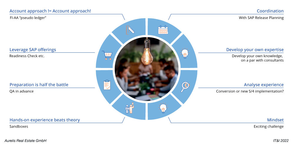 Aurelis decided to use the brownfield approach for the changeover to SAP’s operating system. This approach comprises a change process without modifications. Aurelis was very satisfied with the system introduced in 2014. For reasons of speed and cost savings, the decision was made once again to opt for the “standard conversion”: the brownfield approach. Aurelis was thus able to exercise its own control over the pace of innovation. The brownfield approach has proven successful from the company’s point of view. Three key lessons played a vital role in the success of the project: Use of SAP products, intensive project preparation and internal knowledge building at Aurelis (Figure 1).