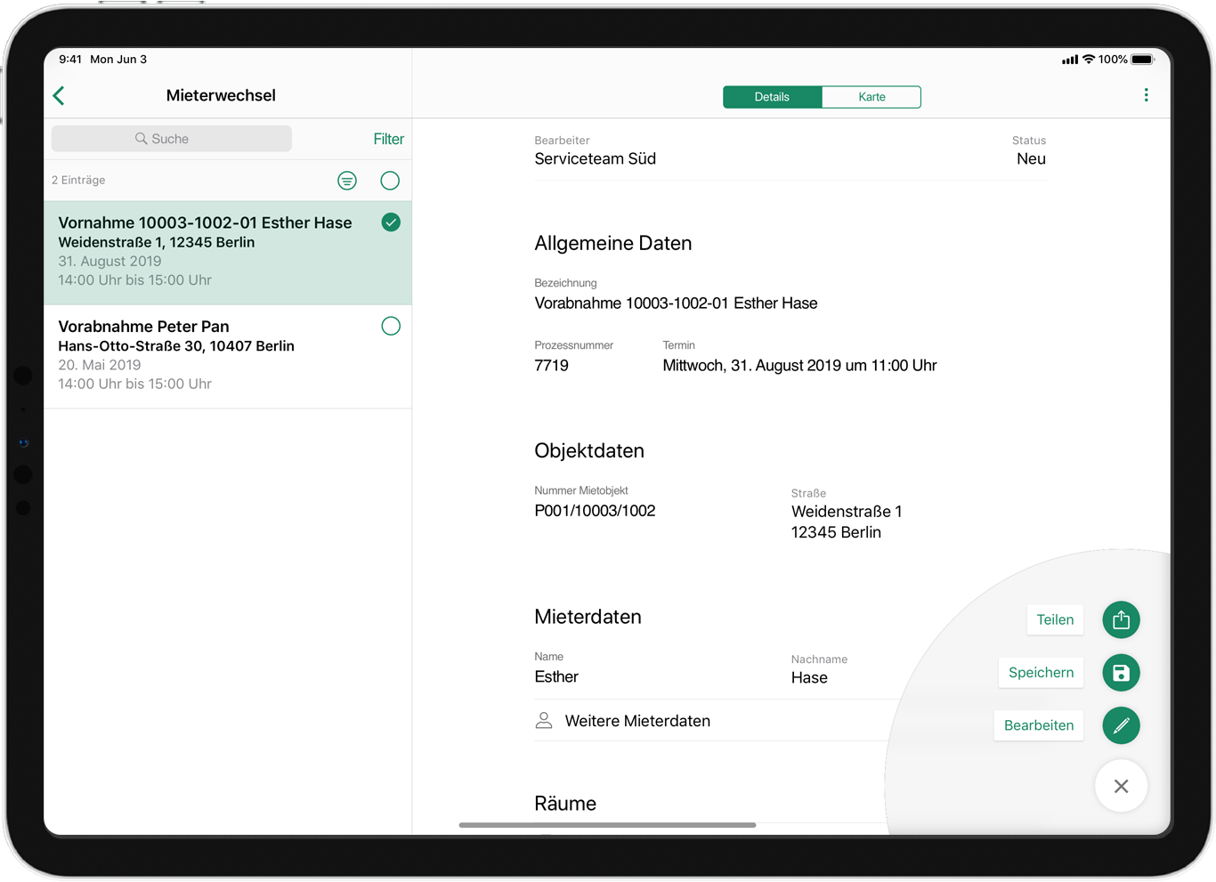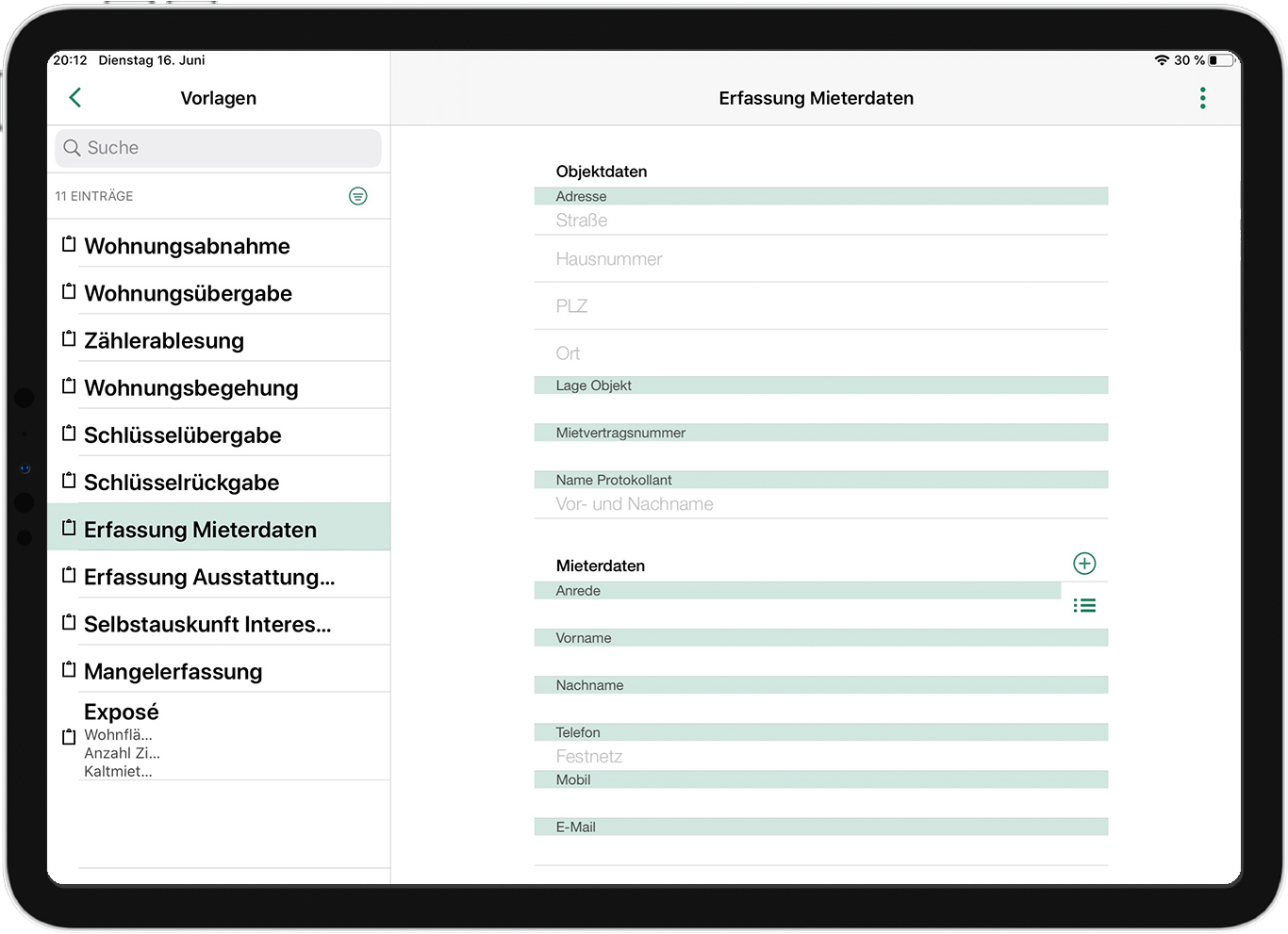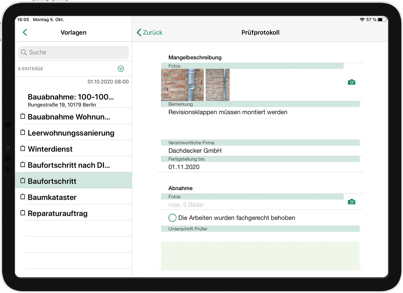 Thanks to a large range of previously stored model forms, employees can carry out apartment handovers or record damage directly on site, for example. The templates thus offer a decisive added value compared to conventional paper forms. The app also makes it possible to provide individual form templates for unplanned processes that can then be completed spontaneously on site depending on the scope of application.