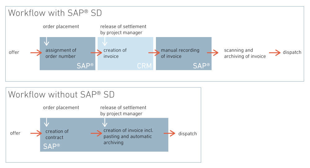 After six months of use, the assessment of the department is positive. It has already been possible on a controlling level to generate the first evaluations, broken down into nearly 400 entered products and services. Moreover, the excellent traceability both for the employees and also for external stakeholders is particularly worth mentioning. All the booked documents and offers, commissions and contracts are now clearly included with each respective contract and, if requested, can be called up immediately with the click of a mouse. This saves time and effort in collating the necessary documents, particularly for business audits. “Nowadays, I can track precisely in the system exactly who made which revision or, for example, which change in the contractual constellations on which date,” explained Ms Schulze-Leifheit, stressing the excellent transparency of the system. The work in the earlier dual system has been omitted completely. Today, there is a corresponding range of different invoice types such as monthly invoices, hourly-rate or fixed-rate invoices and templates, that are used to generate invoices directly from SAP® SD, and which are then attached automatically to the corresponding documents. Regular invoices are even booked automatically. This is carried out using booking templates, which then just need to be processed. For our invoice recipients, we guaranteed the customary quality during the entire conversion process. The original standard was maintained, both in terms of appearance and content. It was only in the item designations that certain individual adjustments had to be made. However, for safety’s sake, a reference to the original designation was stored in the invoices in these cases.