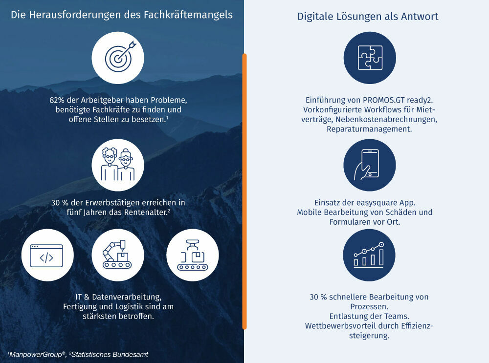 The shortage of skilled workers remains an urgent challenge, especially for the real estate industry. Vacancies, increasing demands and the migration of experienced employees further exacerbate the situation. There is no complete solution – but smart approaches can help. Digitization and automation make it possible to use resources more efficiently, streamline processes and reduce the burden on teams. Tools such as PROMOS.GT ready2 or the easysquare Professional App help to make everyday life easier and to remain capable of acting despite limited capacities. Those who seize these opportunities gain valuable time to develop long-term strategies and assert themselves in the “war for talent”.