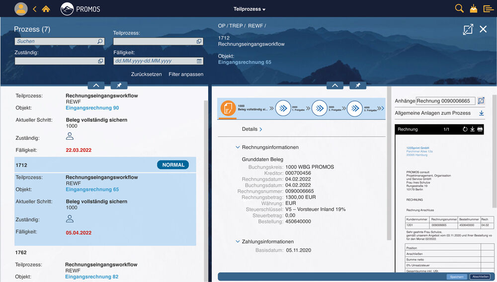 ![]() Figure 2: PROMOS.GT ready2 contains reliable solutions for financial management – from book-keeping and accounting through to controlling and governance. One highlight from the area of finance is the invoice receipt workflow for the digital processing of all transactions relating to incoming invoices. |