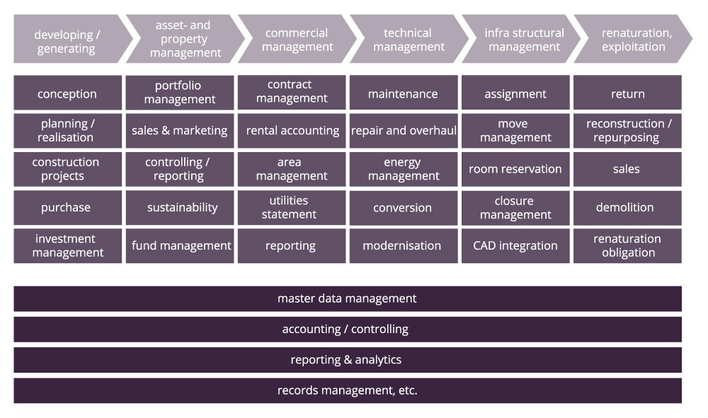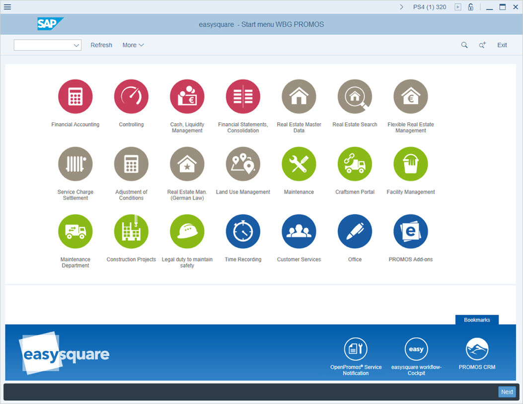 PROMOS.GT is a generic template for using SAP® in real estate and facility management. Solutions, which were created with a customer from the real estate and construction management, are summarised in PROMOS.GT as an open solution library. The template combines tried-and-tested applications and experiences from real estate related consulting since 1998. More than 80 percent of the content of typical projects is based on solutions that can be reused, which are available in PROMOS.GT.