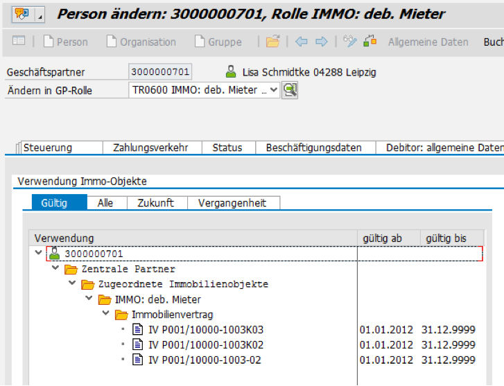 “Where-Used Lists for real estate objects”: This tab displays all the real estate objects that are assigned to the business partner you called up. A total of four tabs are available: Valid, All, Future, Past.
